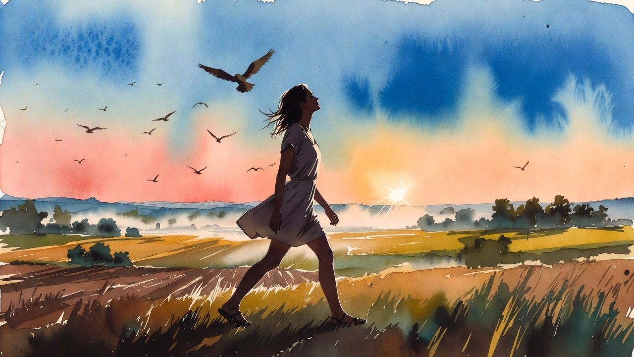 Maria își începe ziua cu o plimbare la răsărit, în căutarea liniștii și a energiei. Urmează poteci înconjurate de copaci și aude susurul unui pârâu apropiat. Observă cum soarele luminează treptat peisajul. În timpul plimbării, respiră adânc, bucurându-se de moment. Înainte să se întoarcă, se așază pe o bancă și reflectează la cât de revigorant este să fie în contact cu natura.