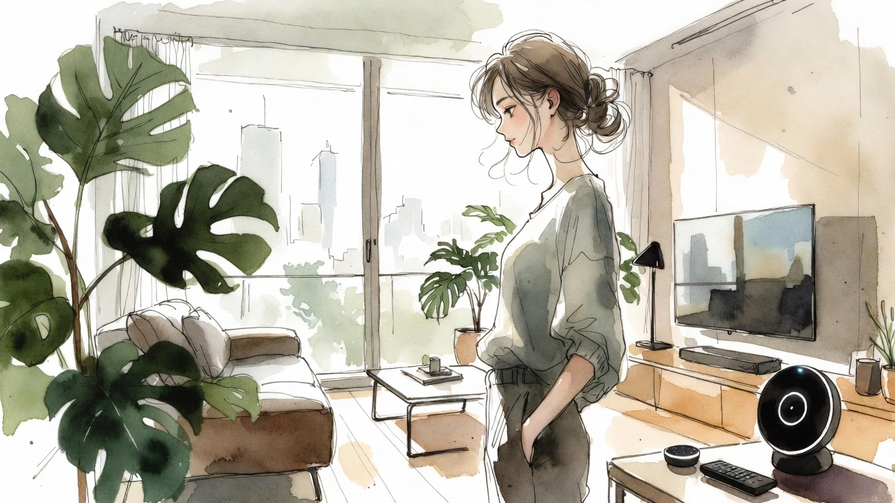 Laura se bucură de casa ei inteligentă. Cu telefonul, controlează luminile și încălzirea. Folosește și o cameră de securitate pentru a vedea cine este la ușă. Când iese din casă, sistemul stinge luminile automat. Îi place cum tehnologia îi îmbunătățește confortul și siguranța.