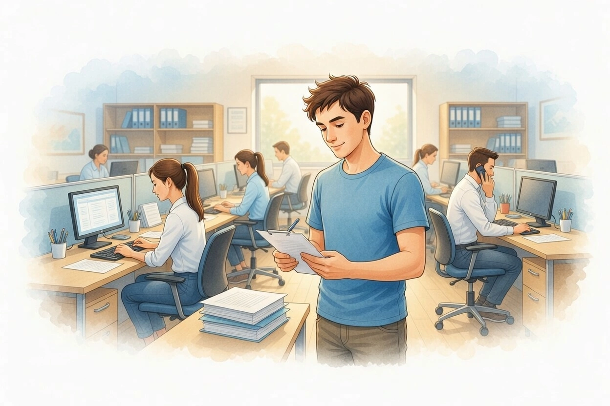 Luis gestiona varias responsabilidades en la oficina. Comienza el día organizando sus prioridades y respondiendo correos urgentes. Más tarde, lidera una reunión sobre nuevos proyectos. Durante la tarde, revisa documentos y elabora un informe detallado. Entre tareas, mantiene una conversación informal con un compañero sobre tendencias del sector. Antes de salir, ajusta su planificación para optimizar su productividad y asegura que todo esté en orden para el día siguiente.